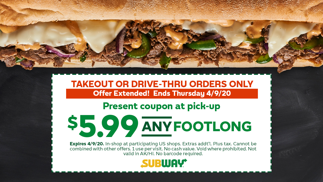 Subway On Twitter This 5 99 Footlong Is Just One Of The Ways We Re Looking Out For You Right Now Take A Screenshot Of The Coupon And Show It At Pickup Take Out